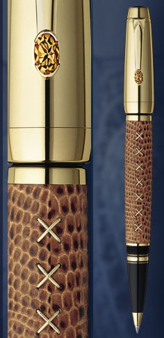 • Корпус: Выполнен из стали и полимера обтянут кожей, металлические части ручки покрыты золотом, клип украшает цитрином